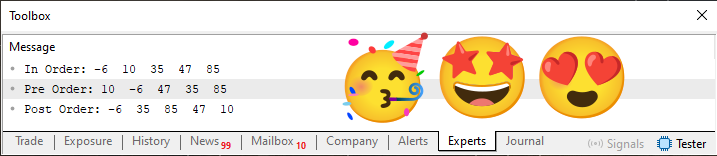 01. //+------------------------------------------------------------------+ 02. #property copyright "Daniel Jose" 03. //+------------------------------------------------------------------+ 04. class stTree 05. { 06. public: 07. int info; 08. stTree *left, 09. *right; 10. }; 11. //+------------------------------------------------------------------+ 12. stTree *store(stTree *root, stTree *r, int info) 13. { 14. if (r == NULL) 15. { 16. r = new stTree; 17. 18. (*r).left = NULL; 19. (*r).right = NULL; 20. (*r).info = info; 21. if (root == NULL) return r; 22. if (info < (*root).info) (*root).left = r; 23. else (*root).right = r; 24. 25. return r; 26. } 27. if (info < (*r).info) return store(r, (*r).left, info); 28. return store(r, (*r).right, info); 29. } 30. //+------------------------------------------------------------------+ 31. string inorder(stTree *root) 32. { 33. static string sz0 = "In Order: "; 34. 35. if (root == NULL) return sz0; 36. 37. inorder((*root).left); 38. sz0 += (root != NULL ? StringFormat("%d ", (*root).info) : ""); 39. inorder((*root).right); 40. 41. return sz0; 42. } 43. //+------------------------------------------------------------------+ 44. string preorder(stTree *root) 45. { 46. static string sz0 = "Pre Order: "; 47. 48. if (root == NULL) return sz0; 49. 50. sz0 += (root != NULL ? StringFormat("%d ", (*root).info) : ""); 51. preorder((*root).left); 52. preorder((*root).right); 53. 54. return sz0; 55. } 56. //+------------------------------------------------------------------+ 57. string postorder(stTree *root) 58. { 59. static string sz0 = "Post Order: "; 60. 61. if (root == NULL) return sz0; 62. 63. postorder((*root).left); 64. postorder((*root).right); 65. sz0 += (root != NULL ? StringFormat("%d ", (*root).info) : ""); 66. 67. return sz0; 68. } 69. //+------------------------------------------------------------------+ 70. void OnStart(void) 71. { 72. stTree *root = NULL; 73. 74. root = store(root, root, 10); 75. store(root, root, -6); 76. store(root, root, 47); 77. store(root, root, 35); 78. store(root, root, 85); 79. 80. Print(inorder(root)); 81. Print(preorder(root)); 82. Print(postorder(root)); 83. } 84. //+------------------------------------------------------------------+