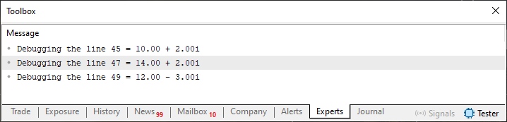. . . 30. //+----------------+ 31. void Debug(uint arg) 32. { 33. PrintFormat("Debugging the line %d = %.02f %c %.02fi", arg, m_r, (m_i < 0 ? '-' : '+'), MathAbs(m_i)); 34. } 35. //+----------------+ 36. }; 37. //+------------------------------------------------------------------+ 38. void OnStart(void) 39. { 40. stComplex a(2, 5), 41. b(8, -3), 42. c; 43. 44. c = a + b; 45. c.Debug(__LINE__); 46. 47. (c += 4).Debug(__LINE__); 48. c = b + 4; 49. c.Debug(__LINE__); 50. } 51. //+------------------------------------------------------------------+