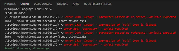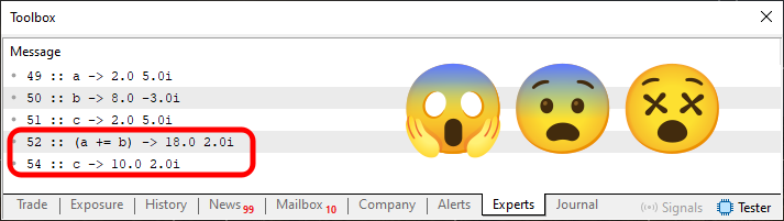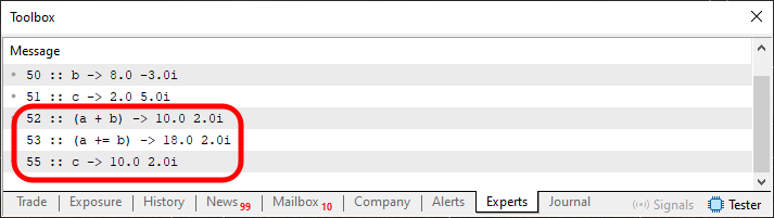 . . . 37. //+------------------------------------------------------------------+ 38. void OnStart(void) 39. { 40. stComplex a(2, 5), 41. b(8, -3), 42. c; 43. 44. c = (a + b).Debug(__LINE__); 45. c.Debug(__LINE__); 46. 47. (c += 4).Debug(__LINE__); 48. c = (b + 4).Debug(__LINE__); 49. c.Debug(__LINE__); 50. } 51. //+------------------------------------------------------------------+