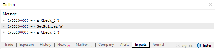 01. //+------------------------------------------------------------------+ 02. #property copyright "Daniel Jose" 03. //+------------------------------------------------------------------+ 04. class C_Demo 05. { 06. public : 07. //+----------------+ 08. C_Demo *Check_1(void) 09. { 10. return GetPointer(this); 11. } 12. //+----------------+ 13. C_Demo *Check_2(void) 14. { 15. return GetPointer(C_Demo()); 16. } 17. //+----------------+ 18. }; 19. //+------------------------------------------------------------------+ 20. #define PrintX(x) PrintFormat("0x%08X -> %s", x, #x) 21. //+------------------------------------------------------------------+ 22. void OnStart(void) 23. { 24. C_Demo a; 25. 26. PrintX(a.Check_1()); 27. PrintX(GetPointer(a)); 28. PrintX(a.Check_2()); 29. } 30. //+------------------------------------------------------------------+