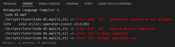 Muito bem, os dois últimos erros nesta imagem 01, estão relacionados diretamente ao operador de atribuição. Isto por que, o compilador não sabe exatamente como agir neste tipo de situação. Lembrando que aqui estaremos seguindo um caminho diferente. E sendo assim, as coisas podem não fazer muito sentido neste primeiro momento. Mas então, vamos mudar o código 01, para o que é visto logo abaixo.