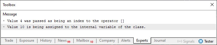 01. //+------------------------------------------------------------------+ 02. #property copyright "Daniel Jose" 03. //+------------------------------------------------------------------+ 04. class stList 05. { 06. //+----------------+ 07. private : 08. //+----------------+ 09. int value; 10. //+----------------+ 11. public : 12. //+----------------+ 13. stList *operator[](const uchar arg) 14. { 15. Print("Value ", arg, " was passed as being an index to the operator []"); 16. 17. return GetPointer(this); 18. } 19. //+----------------+ 20. void operator=(const int arg) 21. { 22. Print("Value ", arg," is being assigned to the internal variable of the class."); 23. } 24. //+----------------+ 25. }; 26. //+------------------------------------------------------------------+ 27. void OnStart(void) 28. { 29. stList demo; 30. 31. demo[4] = 10; 32. } 33. //+------------------------------------------------------------------+