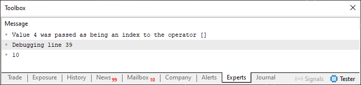 . . . 26. //+------------------------------------------------------------------+ 27. void OnStart(void) 28. { 29. stList demo; 30. 31. demo.operator[](4).operator=(10); 32. } 33. //+------------------------------------------------------------------+