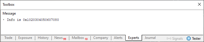 01. //+------------------------------------------------------------------+ 02. #property copyright "Daniel Jose" 03. //+------------------------------------------------------------------+ 04. class stDemo 05. { 06. //+----------------+ 07. private : 08. //+----------------+ 09. union un_0 10. { 11. ulong u64; 12. uchar u8[8]; 13. }m_info; 14. //+----------------+ 15. public : 16. //+----------------+ 17. void operator=(const ulong arg) 18. { 19. m_info.u64 = arg; 20. } 21. //+----------------+ 22. void Debug(const int arg) 23. { 24. PrintFormat("Info is 0x%I64X", m_info.u64); 25. } 26. //+----------------+ 27. }; 28. //+------------------------------------------------------------------+ 29. void OnStart(void) 30. { 31. stDemo demo; 32. 33. demo = 0x1020304050607080; 34. 35. demo.Debug(__LINE__); 36. } 37. //+------------------------------------------------------------------+