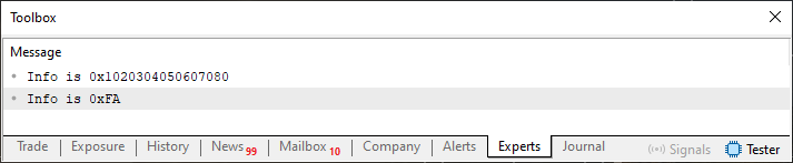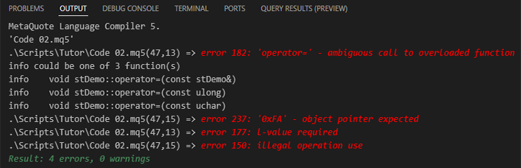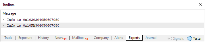 . . . 40. //+------------------------------------------------------------------+ 41. void OnStart(void) 42. { 43. stDemo demo; 44. 45. demo = 0x1020304050607080; 46. demo.Debug(__LINE__); 47. demo[1] = (uchar) 0xFA; 48. demo.Debug(__LINE__); 49. } 50. //+------------------------------------------------------------------+
