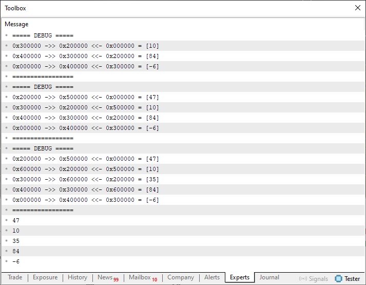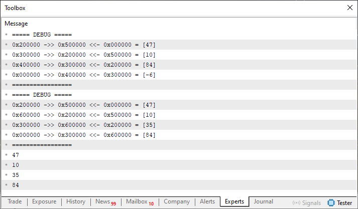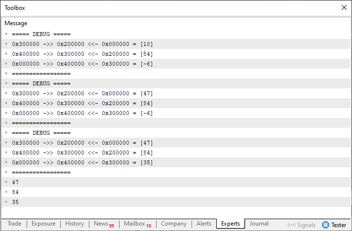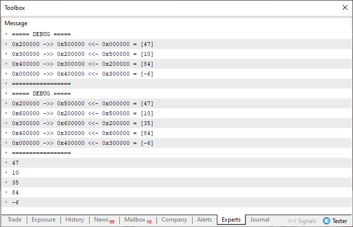 . . . 098. //+------------------------------------------------------------------+ 099. void OnStart(void) 100. { 101. stList <char> list; 102. 103. list[0] = 10; 104. list[1] = 84; 105. list[2] = -6; 106. list.Debug(); 107. list[0] = 47; 108. list.Debug(); 109. list[2] = 35; 110. 111. list.Debug(); 112. 113. for (char info; list.Restore(info, 0);) 114. Print(info); 115. }; 116. //+------------------------------------------------------------------+