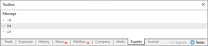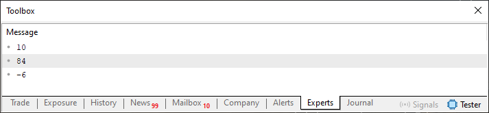 01. //+------------------------------------------------------------------+ 02. #property copyright "Daniel Jose" 03. //+------------------------------------------------------------------+ 04. #include "Include\C_Demo_03.mqh" 05. //+------------------------------------------------------------------+ 06. void OnStart(void) 07. { 08. C_Demo <char> demo; 09. 10. demo << 10; 11. demo << 84; 12. demo << -6; 13. 14. for (char info; demo >> info;) 15. Print(info); 16. }; 17. //+------------------------------------------------------------------+