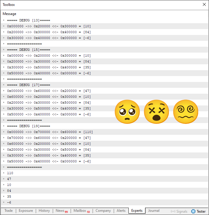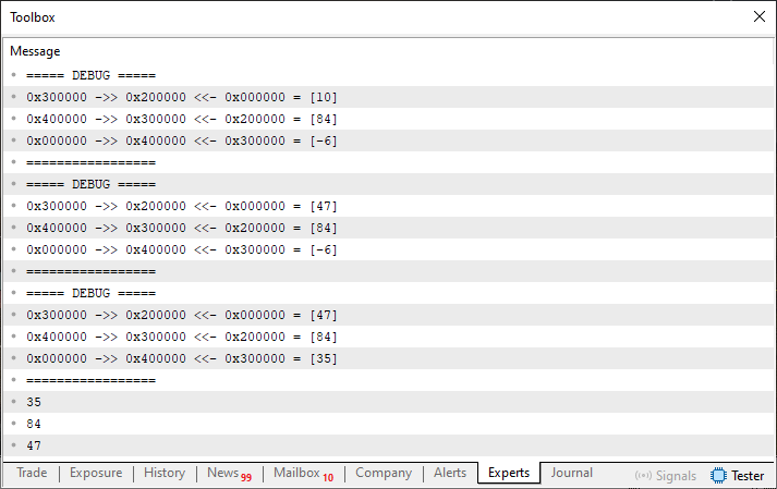 01. //+------------------------------------------------------------------+ 02. #property copyright "Daniel Jose" 03. //+------------------------------------------------------------------+ 04. #include "Include\C_Demo_04.mqh" 05. //+------------------------------------------------------------------+ 06. void OnStart(void) 07. { 08. C_Demo <char> demo; 09. 10. demo << 10; 11. demo << 84; 12. demo << -6; 13. demo[2] <<= 35; 14. demo[0] <<= 47; 15. demo[0] <<= 110; 16. demo.Debug(__LINE__); 17. demo <<= 51; 18. demo.Debug(__LINE__); 19. 20. for (char info; demo >> info;) 21. Print(info); 22. }; 23. //+------------------------------------------------------------------+