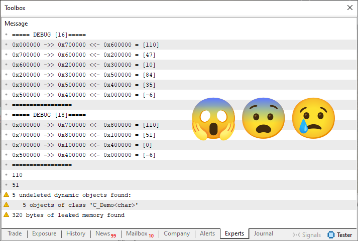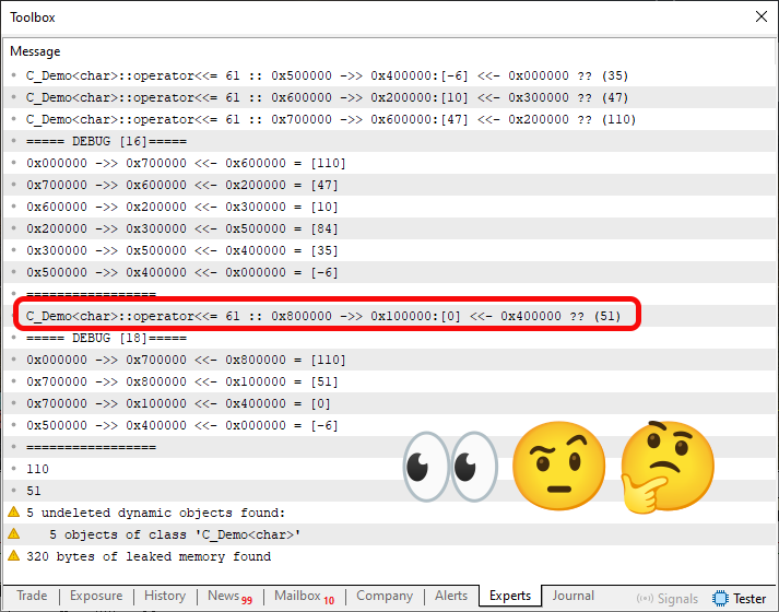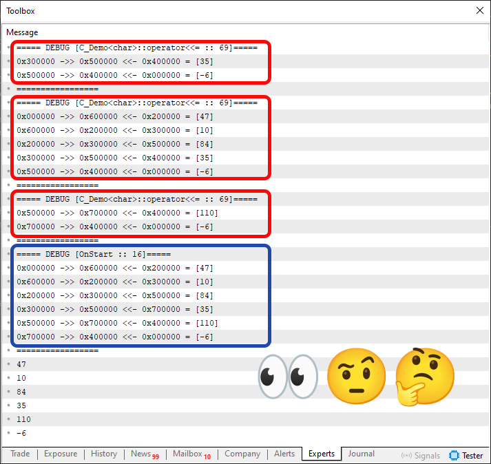 . . . 51. //+----------------+ 52. void operator<<=(const T arg) 53. { 54. C_Demo <T> *loc = new C_Demo <T>; 55. 56. (*loc).m_info = arg; 57. (*loc).m_next = GetPointer(this); 58. (*loc).m_prev = m_prev; 59. if (m_prev != NULL) (*m_prev).m_next = loc; 60. m_prev = loc; 61. PrintFormat("%s %d :: 0x%06X ->> 0x%06X:[%d] <<- 0x%06X ?? (%d)", __FUNCTION__, __LINE__, m_prev, GetPointer(this), m_info, m_next, arg); 62. } 63. //+----------------+ . . .