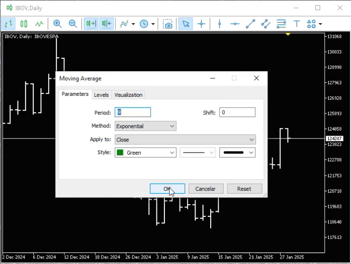 Agora preste atenção meu caro leitor. Normalmente você irá ver as médias móveis sendo plotadas de um passado muito distante até a barra mais atual presente no gráfico. Porém, como programadores, podemos fazer as coisas de uma forma totalmente diferente. Impedindo assim que o gráfico fique demasiadamente poluído, ou com informações desnecessárias.