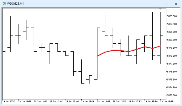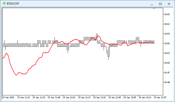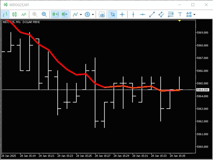 Este código 01, tem tudo que precisamos para criar uma média móvel a plotar no gráfico. É bem verdade, que não podemos mudar o tipo de média e o período, ou melhor dizendo, a quantidade de barras que serão usadas no cálculo. Porém podemos mudar diversas coisas, como cor, espessura, estilo da linha, e o padrão de preço que será utilizado. E tudo isto fazendo uso deste código aparentemente ridículo em termos de grau de dificuldade.