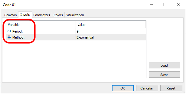 . . . 14. //+------------------------------------------------------------------+ 15. input uint def_nPeriods = 9; //Period: 16. input ENUM_MA_METHOD def_MA_Method = MODE_EMA; //Method: 17. //+------------------------------------------------------------------+ . . .