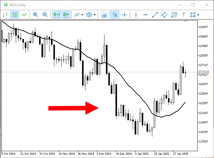 O motivo é que existe a questão da direção em que o cálculo está sendo feito. Como foi visto na imagem 01. O nosso código 01, está fazendo o cálculo na direção dos dados mais antigos para os dados mais recentes. E possivelmente em algum momento ele não sabe como trabalhar com isto. Fazendo com que o indicador falhe e a média não venha a ser plotada.Justamente por conta que o indicador está com dados inválidos. Por isto que na imagem 06, podemos ver aquela informação sendo mostrada.