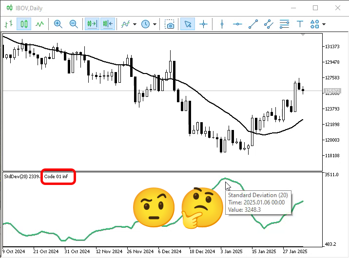 Mas que coisa mais doida. Não é que de fato funciona. Então o erro está no nosso código. Sim meu caro leitor, o erro está no código. Ok, agora não sei como corrigir isto. Já que diferente do que foi visto no artigo anterior, onde estamos pedindo para o que o cálculo fosse executado pelo MetaTrader 5. Agora estamos fazendo nos mesmos os cálculos. E mesmo assim o indicador falhou. Por que?