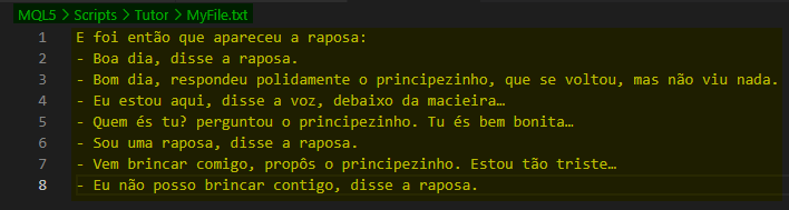 Este código 01, quando compilado, irá na linha quatro pegar todo o conteúdo presente no arquivo mostrado na imagem 01 e o embutir dentro do executável. Agora pense no seguinte: Para o executável, o que esta linha quatro contém, é um array gigante com todo o conteúdo que antes estava presente dentro do arquivo MyFile.txt. A partir de agora todo aquele conteúdo estará presente dentro deste array. Porém para simplificar as coisas, estamos usando o tipo string como forma de categorizar as informações, dentro desta constante gigante que recebe o nome de Antoine. Retornando ao que você certamente já conhece e sabe interpretar, o que estamos fazendo neste código 01 seria o equivalente mostrado no código 02, visto logo abaixo.01. //+------------------------------------------------------------------+ 02. #property copyright "Daniel Jose" 03. //+------------------------------------------------------------------+ 04. const string Antoine = 05. "E foi então que apareceu a raposa:\n\r" \ 06. "- Boa dia, disse a raposa.\n\r" \ 07. "- Bom dia, respondeu polidamente o principezinho, que se voltou, mas não viu nada.\n\r"\ 08. "- Eu estou aqui, disse a voz, debaixo da macieira…\n\r" \ 09. "- Quem és tu? perguntou o principezinho. Tu és bem bonita…\n\r" \ 10. "- Sou uma raposa, disse a raposa.\n\r" \ 11. "- Vem brincar comigo, propôs o principezinho. Estou tão triste…\n\r" \ 12. "- Eu não posso brincar contigo, disse a raposa.\n\r"; 13. //+------------------------------------------------------------------+ 14. void OnStart(void) 15. { 16. Print(Antoine); 17. } 18. //+------------------------------------------------------------------+