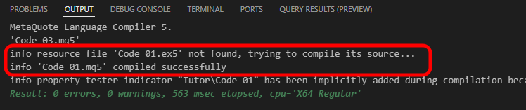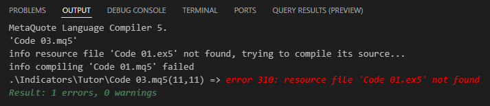 No artigo anterior, menciono que para o indicador visto no código 03 seja colocado no gráfico. Precisamos garantir que ele tenha sido compilado e que esteja disponível para ser executado. Isto é fato. Agora quando você for compilar este código 06, algo mágico irá acontecer. Isto por que, SE o executável NÃO EXISTIR, o compilador irá criar o executável do código definido na linha nove. Hã? Mas como assim? Que coisa mais maluca é esta? Você está me dizendo que só de termos o código e tentarmos compilar um código que necessite do executável, o compilador irá criar ele para nós? Sim, é isto mesmo que irá acontecer. A mensagem disparada pelo compilador é um tanto quanto grande. E como temos um limite para a largura de imagens, a mesma não será mostrada por inteiro. Porém a parte que nos interessa pode ser vista em destaque logo abaixo.