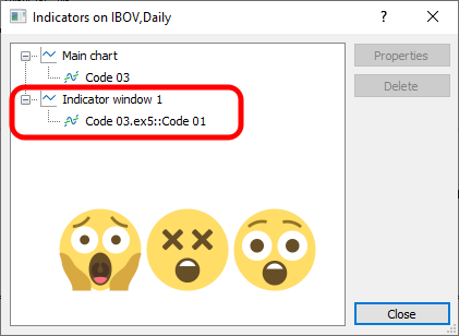 Legal, temos um incrédulo entre nós. Pois vamos verificar se o código 07 está ou não está conseguindo fazer o que foi dito aqui. Para isto, bastará abrirmos a lista de indicadores presentes no gráfico e checar o que estará sendo informado ali. Ao fazermos isto, será visto algo parecido com a imagem logo abaixo.