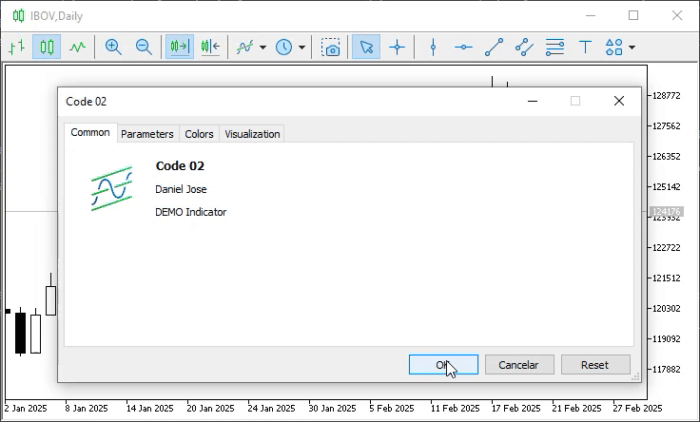 Devido ao fato que de não quero complicar as coisas neste momento, sem necessidade. Vamos fazer o seguinte: Vamos criar um outro indicador, e com base no que já foi explicado em artigos recentemente postados. Vamos fazer com que este novo indicador, mande o indicador construído no código 02, ser lançado para dentro do que seria uma sub janela. Lembrando que este indicador implementado no código 02, NÃO FAZ USO DE UMA SUB JANELA. Mas sim utiliza a janela principal como meio de interação com o usuário, ou operador do gráfico. Para fazer isto, iremos utilizar o código que pode ser observado logo abaixo.01. //+------------------------------------------------------------------+ 02. #property copyright "Daniel Jose" 03. //+------------------------------------------------------------------+ 04. #property description "DEMO Indicator" 05. //+------------------------------------------------------------------+ 06. #property indicator_chart_window 07. #property indicator_plots 0 08. //+------------------------------------------------------------------+ 09. #define def_Resource "Code 01.ex5" 10. //+------------------------------------------------------------------+ 11. #resource def_Resource 12. //+------------------------------------------------------------------+ 13. int OnInit(void) 14. { 15. ChartIndicatorAdd(0, (int)ChartGetInteger(0, CHART_WINDOWS_TOTAL), iCustom(NULL, NULL, "::" + def_Resource)); 16. 17. return INIT_SUCCEEDED; 18. }; 19. //+------------------------------------------------------------------+ 20. int OnCalculate(const int rates_total, const int prev_calculated, const int begin, const double &price[]) 21. { 22. return rates_total; 23. }; 24. //+------------------------------------------------------------------+