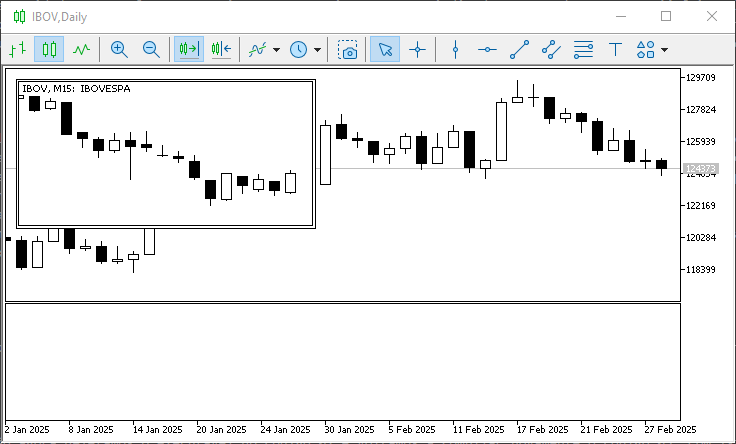 Caramba, de fato este tipo de coisa se mostrou um verdadeiro show de bola. Que coisa mais maravilhosa. Agora sim já me sinto bem mais confiante e ainda mais interessado em estudar cada detalhe em cada um dos seus artigos. No entanto, notei que o código 06, não tem somente a linha seis diferente do código 05. Por que? Será que não podemos usar o código 05, fazendo apenas e tão somente a mudança na linha seis? De fato, podemos meu caro leitor. Porém, devido ao fato de que este código 06 seria o que precisaria ser o código 02 para que o objeto OBJ_CHART pudesse ser posicionado no local correto. Fiz as mudanças apenas para demonstrar esta atualização do código 02. Mas nada lhe impede de utilizar o código 05 com a única mudança sendo feita na linha seis. O resultado seria algo que ainda não vamos usar neste primeiro momento. Entretanto, pode ser que você já esteja planejando algo, então vamos ver como deveria ser feito. Sendo que no anexo, você também terá estes códigos para experimentar. A primeira mudança iria gerar o código visto logo abaixo.01. //+------------------------------------------------------------------+ 02. #property copyright "Daniel Jose" 03. //+------------------------------------------------------------------+ 04. #property description "DEMO Indicator" 05. //+------------------------------------------------------------------+ 06. #property indicator_chart_window 07. #property indicator_height 150 08. #property indicator_plots 0 09. //+------------------------------------------------------------------+ 10. #define def_ShortName "Test 123." 11. //+------------------------------------------------------------------+ 12. class C_MiniChart 13. { 14. private : 15. //+----------------+ 16. string m_szNameObject; 17. int m_Sub; 18. //+----------------+ 19. void SetInteger(ENUM_OBJECT_PROPERTY_INTEGER prop, int value) { ObjectSetInteger(0, m_szNameObject, prop, value); } 20. //+----------------+ 21. int WhatSubWin(void) 22. { 23. for (int c0 = 0; c0 < (int)(ChartGetInteger(0, CHART_WINDOWS_TOTAL)); c0++) 24. for (int c1 = (ChartIndicatorsTotal(0, c0) - 1); c1 >= 0; c1--) 25. if (ChartIndicatorName(0, c0, c1) == def_ShortName) 26. return c0; 27. return INVALID_HANDLE; 28. } 29. //+----------------+ 30. public : 31. //+----------------+ 32. C_MiniChart(string szName) 33. { 34. if ((m_Sub = WhatSubWin()) == INVALID_HANDLE) return; 35. ObjectCreate(0, m_szNameObject = szName, OBJ_CHART, m_Sub, 0, 0); 36. ObjectSetString(0, m_szNameObject, OBJPROP_SYMBOL, _Symbol); 37. SetInteger(OBJPROP_XDISTANCE, 10); 38. SetInteger(OBJPROP_YDISTANCE, 0); 39. SetInteger(OBJPROP_XSIZE, 300); 40. SetInteger(OBJPROP_YSIZE, indicator_height); 41. SetInteger(OBJPROP_PERIOD, PERIOD_M15); 42. SetInteger(OBJPROP_DATE_SCALE, false); 43. SetInteger(OBJPROP_PRICE_SCALE, false); 44. SetInteger(OBJPROP_SELECTABLE, true); 45. SetInteger(OBJPROP_SELECTED, false); 46. } 47. //+----------------+ 48. ~C_MiniChart() 49. { 50. ObjectDelete(0, m_szNameObject); 51. ChartRedraw(); 52. } 53. //+----------------+ 54. }*gl_MiniChart; 55. //+------------------------------------------------------------------+ 56. int OnInit(void) 57. { 58. IndicatorSetString(INDICATOR_SHORTNAME, def_ShortName); 59. 60. gl_MiniChart = new C_MiniChart("Mini Chart"); 61. 62. return INIT_SUCCEEDED; 63. }; 64. //+------------------------------------------------------------------+ 65. int OnCalculate(const int rates_total, const int prev_calculated, const int begin, const double &price[]) 66. { 67. return rates_total; 68. }; 69. //+------------------------------------------------------------------+ 70. void OnDeinit(const int reason) 71. { 72. delete gl_MiniChart; 73. }; 74. //+------------------------------------------------------------------+