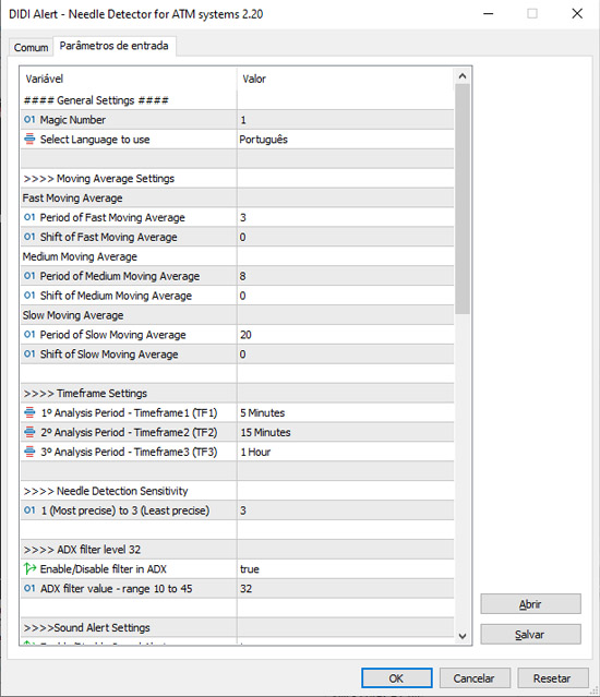 Depois que o usuário encontrar a melhor configuração para trabalhar com o ”DIDI ALERT – Detector de Agulhadas da ATM Systems” poderá utilizar o recurso do próprio Metatrader 5 disponível nea aba "Parâmetros de Entrada" para salvar as suas preferencias, com um nome que desejar, bastando clicar no botão Salvar eliminando a necessidade de começar do zero toda a configuração quando inicializar o Didi Alert, apenas clicando no botão Abrir e carregar sua respectiva configuração personalizada. (ver imagem abaixo)