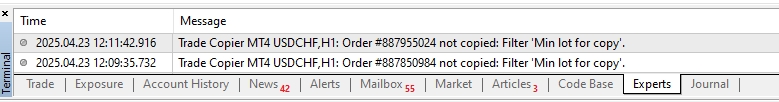 Para determinar todos os motivos pelos quais uma ordem ou posição não foi copiada, acesse a aba "Expert" do terminal e encontre os registros que foram gerados no momento em que a ordem deveria ter sido copiada. Observe que o horário de criação do registro é indicado pelo horário do seu computador, e o horário de abertura da ordem é indicado pelo horário do terminal. Encontre nesta seção a mensagem contendo o número do ticket da ordem que não foi copiada. Role a lista de mensagens até a data atual para determinar todas as restrições aplicadas a esta ordem.