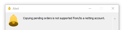 | Você está tentando habilitar a cópia de ordens pendentes de/para uma netting account. O Trade Copier não suporta a cópia de ordens pendentes de/para uma netting account. |