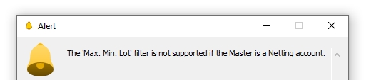 | Você está tentando habilitar o filtro "Lote Máx. Mín." ao copiar de uma netting account. O Trade Copier não suporta o filtro "Lote Máx. Mín." quando o Master é uma netting account. |