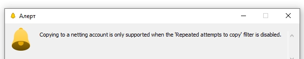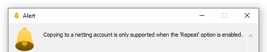 | Você está tentando habilitar o filtro "Copiar Repetir" em uma netting account. O Trade Copier não suporta trabalhar com o filtro "Copiar Repetir" habilitado se o Slave for uma netting account. |