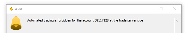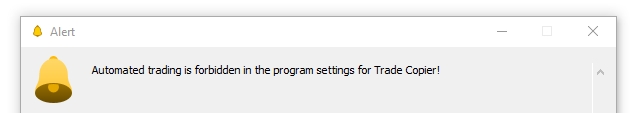 | A corretora proibiu a negociação automática na conta de negociação do destinatário, de modo que o copiador não poderá realizar operações de negociação (copiar ordens e posições). A proibição é definida pela corretora no servidor de negociação, tecnicamente o copiador, e você não tem acesso a essa configuração. Verifique com seu corretor se essa restrição pode ser suspensa. Ou troque de corretora (a maioria das corretoras não proíbe a negociação automática). |