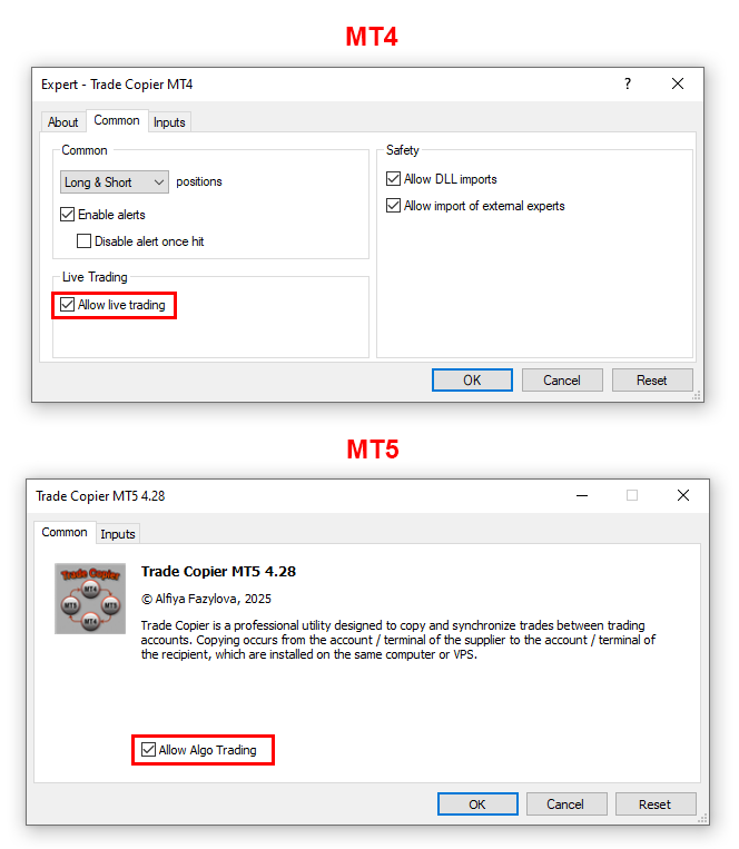| A negociação automática está desativada para o Trade Copier. Para que o Trade Copier possa realizar operações de negociação, você precisa habilitar a negociação automática para o copiador. Para isso, na janela de configurações do copiador, acesse a aba "Geral" e marque a caixa "Permitir que o consultor negocie" para o mt4 ou "Permitir negociação algorítmica" para o mt5. |