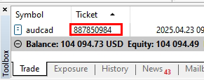 Se a ordem ou posição estiver no mercado, acesse o terminal do destinatário e abra a aba "Negociação" no painel "Escravo". Certifique-se de que essa aba tenha uma linha com o ticket especificado.