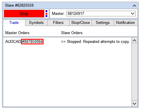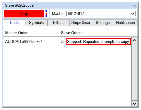 Uma ordem pode não ser copiada por vários motivos ao mesmo tempo, que podem ocorrer em sequências diferentes. Por exemplo, a imagem acima mostra o motivo "Stopped: Repeated attempts to copy", o que significa que, no momento, o filtro "Tentativas repetidas de cópia" = 30 segundos está em vigor para esta posição (mais de 30 segundos se passaram desde que a posição foi aberta no fornecedor, portanto, a copiadora não tentará copiá-la). Esta mensagem não informa o motivo pelo qual a posição não foi copiada no momento certo, nos primeiros 30 segundos desde que a posição foi aberta na conta do fornecedor.