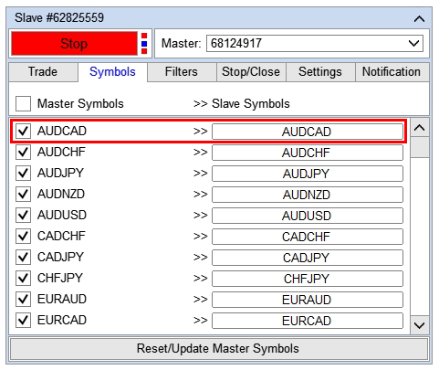 - Abra a aba Símbolos no painel Escravo e verifique a lista de símbolos. Se a lista estiver ausente, clique no botão Redefinir/Atualizar Símbolos Mestre e reinicie o terminal.