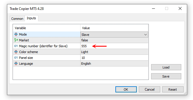 - Pare de copiar no antigo Slave clicando no botão Parar em seu painel. Execute a copiadora no modo Slave no novo terminal com os mesmos parâmetros de entrada do Slave do terminal antigo (o número Magic no antigo Slave e no novo Slave devem corresponder). Certifique-se de que o novo Slave aceitou as configurações necessárias e a lista de símbolos copiados. A aba "Negociação" deve exibir todas as ordens e posições que estão no mercado.
