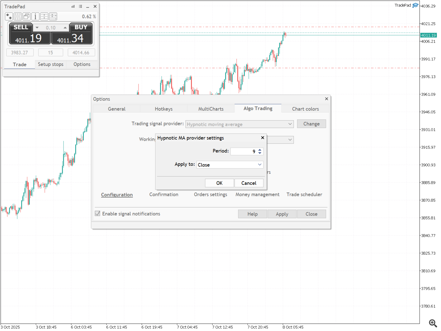 Para negociação algorítmica no TradePad, foi adicionado um sistema de provedores de sinais de negociação. Nesta fase, você tem acesso a um provedor de sinais de negociação baseado no indicador de tendência "Hypnotic Moving Average", que também está incluído na coleção de indicadores da ferramenta MultiCharts. No futuro, será possível expandir a base de provedores de negociação, o que lhe dará uma escolha na construção do seu sistema de negociação. Todos os provedores serão publicados aqui com uma descrição de seu uso na forma de especialistas separados para teste no testador de estratégias. Isso lhe dará a oportunidade de testar o provedor no histórico antes de usá-lo em negociações reais. Informações mais detalhadas sobre a conexão de provedores de negociação serão fornecidas posteriormente, quando eu passar a descrever as configurações do TradePad.