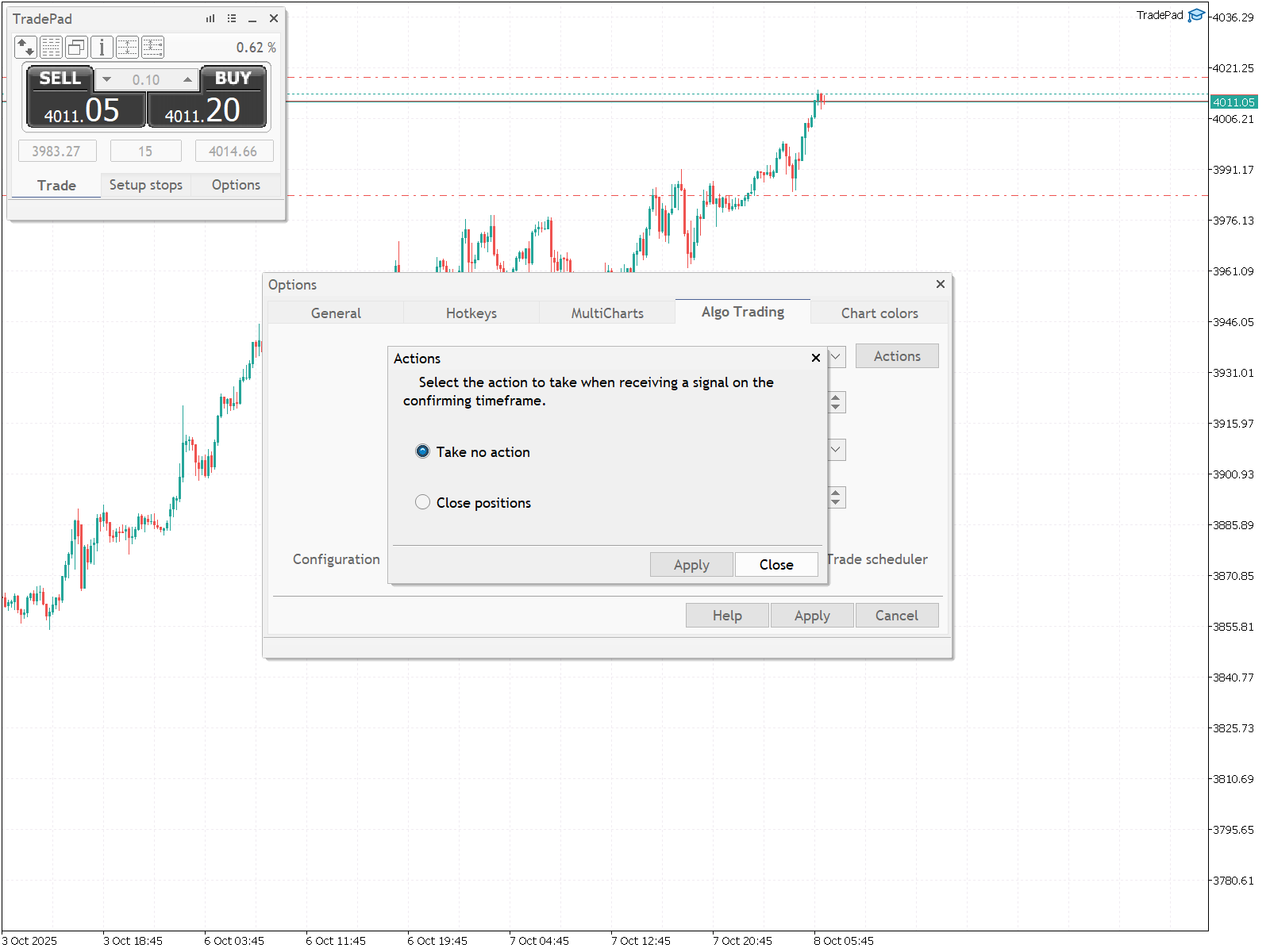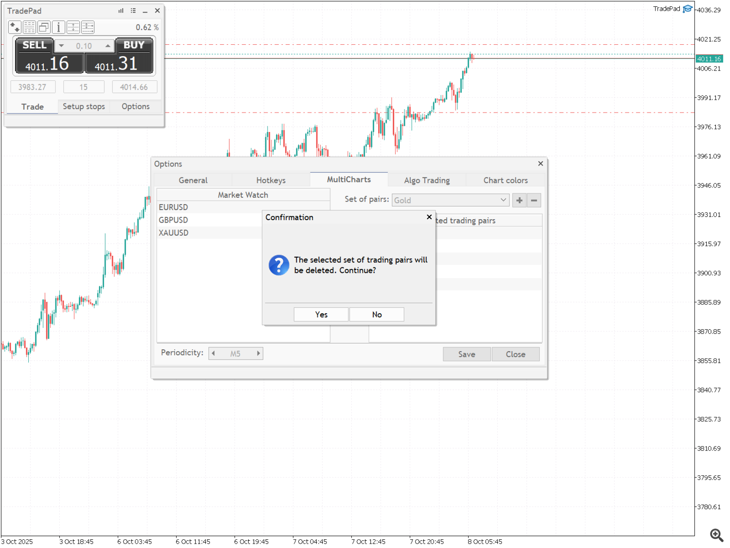 - O botão "Fechar aplicativo" remove o TradePad do gráfico;