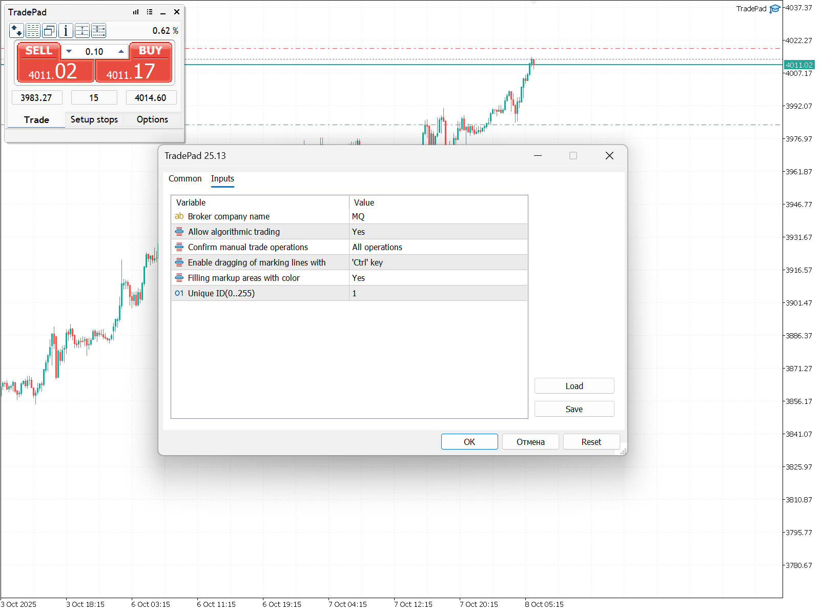 Antes de descrever cada ferramenta separadamente, começarei com o principal: uma descrição dos parâmetros externos do TradePad e da janela principal do aplicativo.