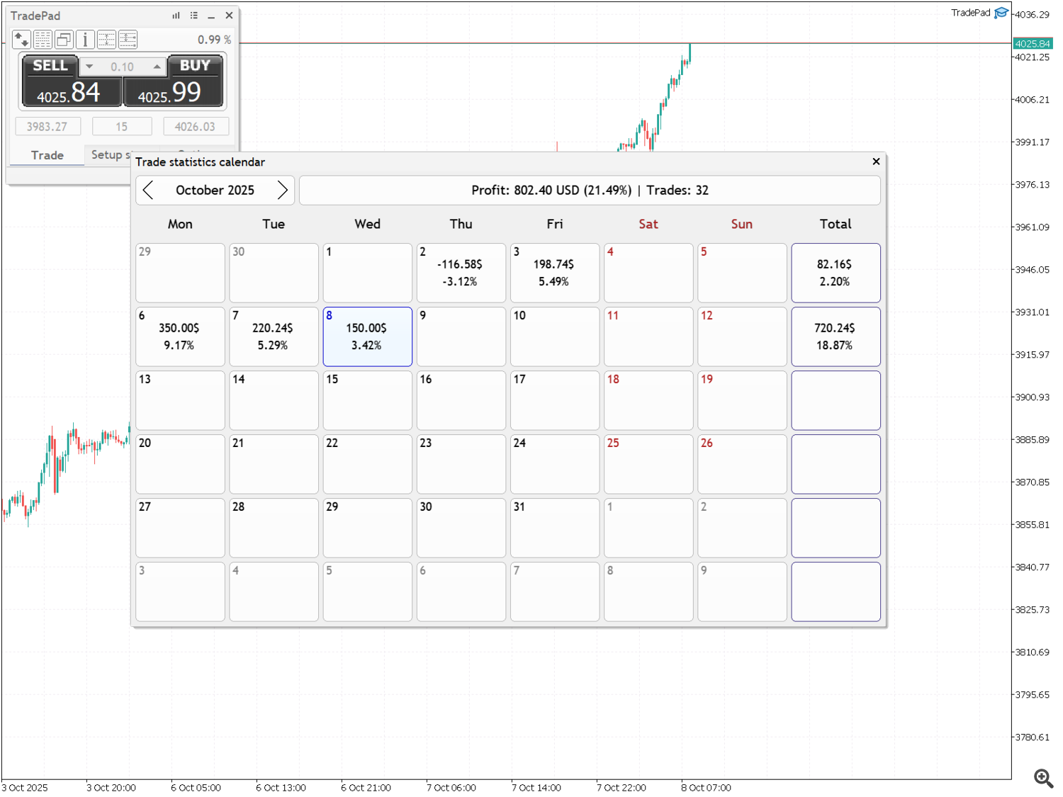 - Calendário de estatísticas de negociação para visualizar os resultados de negociação de um dia, semana ou mês;