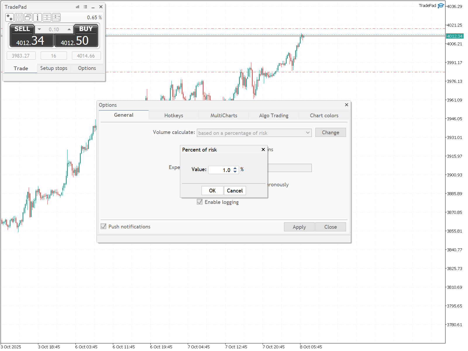 Nesta aba, você tem a opção de habilitar/desabilitar as notificações PUSH geradas pelo aplicativo durante a operação, alternando o elemento "Push notifications". O próximo elemento, "Track all orders and positions", habilita/desabilita o rastreamento de posições e ordens com identificadores diferentes. Quando desabilitado, o TradePad rastreará apenas posições e ordens com o identificador especificado anteriormente (Janela principal -> aba "Options" -> IExpert ID). Para rastrear posições e ordens com identificadores diferentes, marque a caixa "Track all orders and positions" e especifique todos os identificadores separados por vírgulas no campo Expert ID's. Para realizar operações de negociação assíncronas sem esperar que o servidor de negociação responda à solicitação enviada, marque a caixa "Send trade requests asynchronously". Várias mensagens são geradas durante a execução do TradePad. Para enviar essas mensagens para o log "Experts", marque a caixa "Enable logging". Você também pode definir a porcentagem de risco para o cálculo automático do volume do lote ao usar a ferramenta de marcação de níveis de negociação.