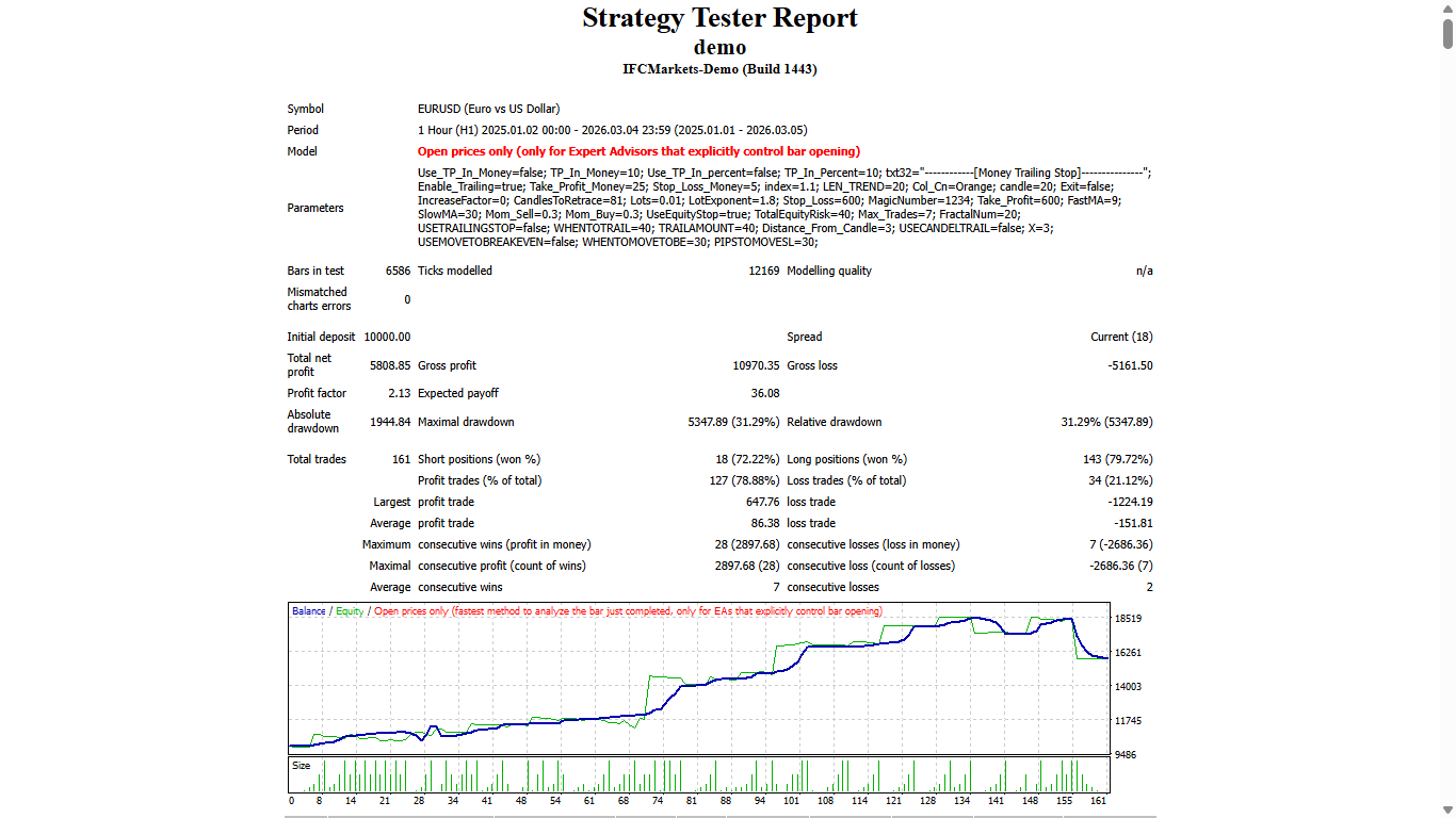 - During tests, the EA only draws the Fibonacci Arcs on the screen in visual mode without considering them in the creation of trades,
