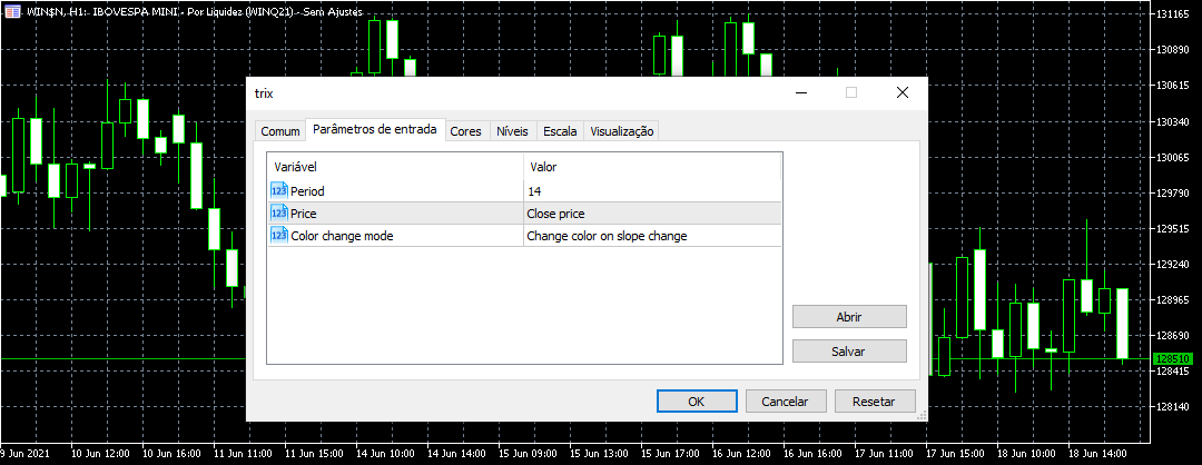 Baixei o indicador TRIX -> https://www.mql5.com/pt/code/23115 mas ao jogar ele no gráfico não carrega.