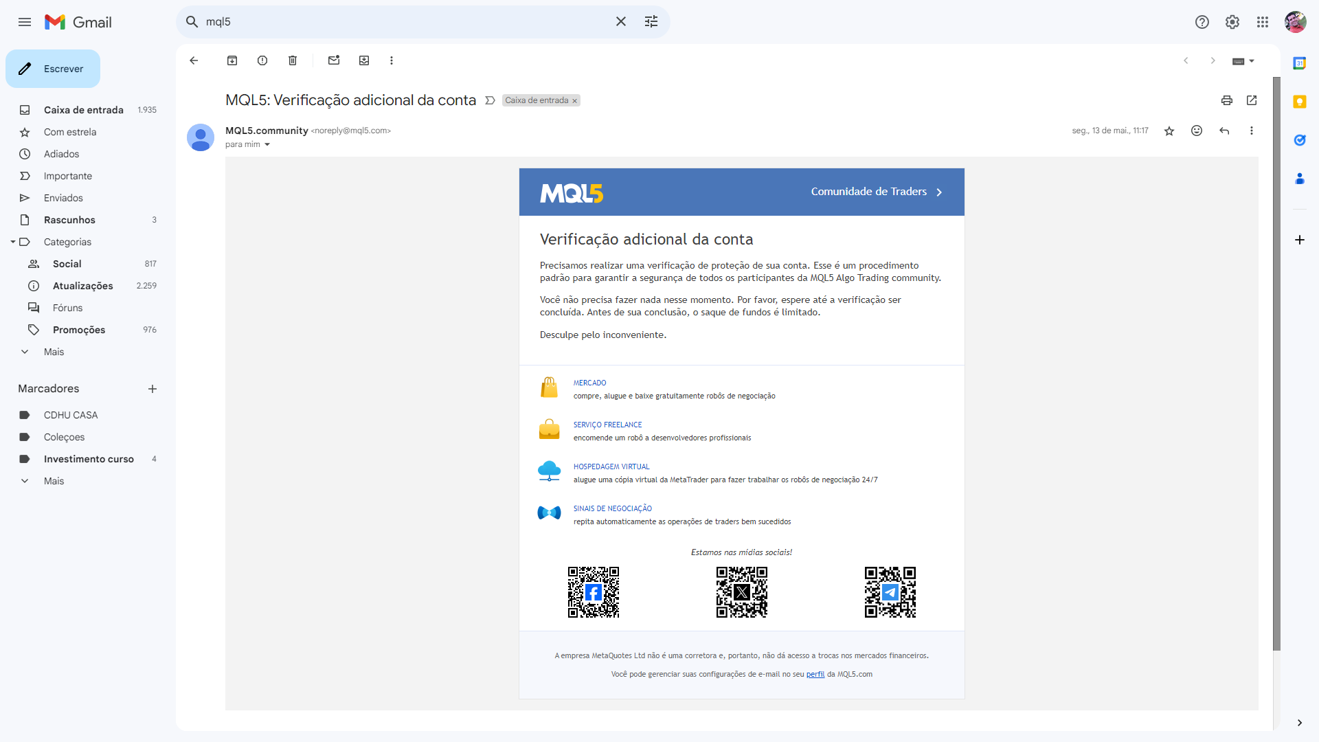 Recebi um email da MQL5 me avisando que eu estava passando por uma "Verificação Adicional de Conta" no dia 13/05/2024