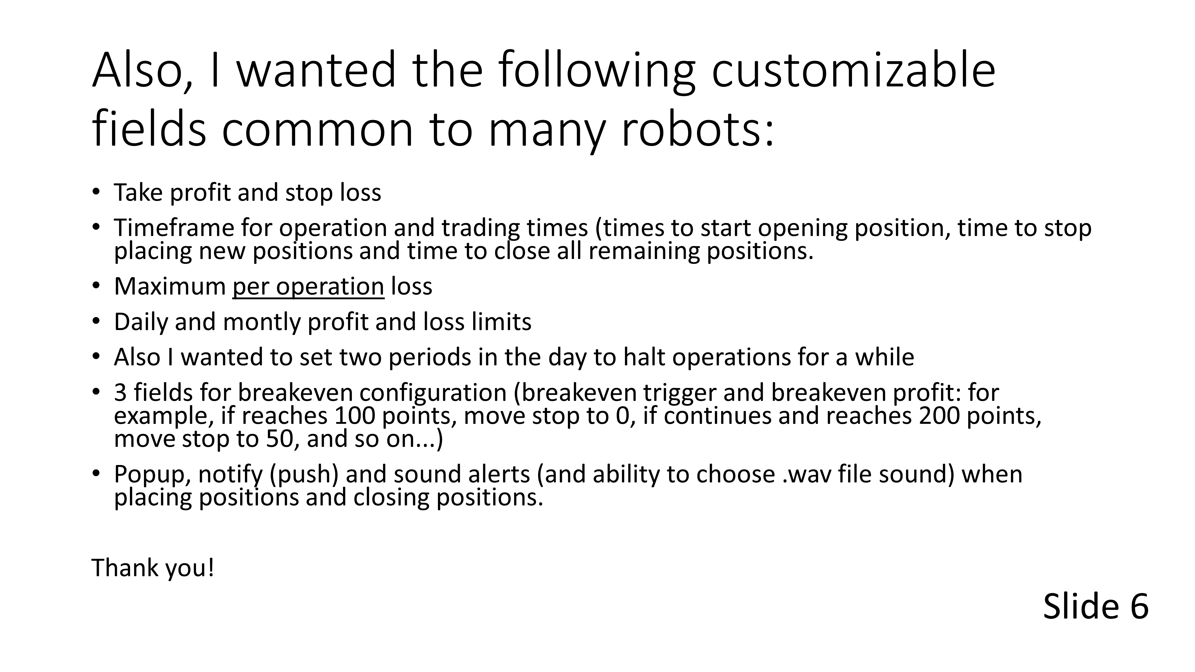 Please follow the slides attached to understand the strategy and all robot customizable fields I wanted to include. Thank you!