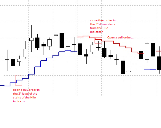 The buy order must be executed as soon as the market reaches 3 steps of the Hilo indicator, and the exit its the oposite, when the market reaches 3 steps down at the stairs from the Hilo activator.