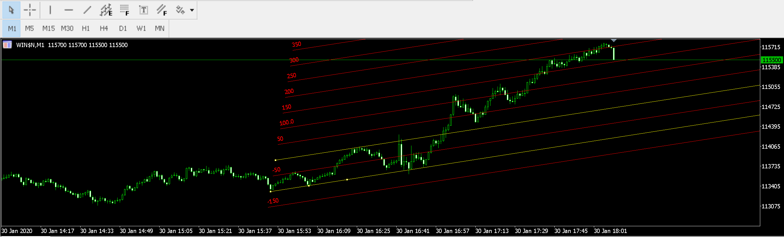 1. Reconheça as linhas de um canal que eu trace (canal com mais de duas linhas). O robô só deve operar após eu traçar o canal manualmente. Caso seja necessário definir uma ferramenta para traçar o desenho do canal, eu prefiro a ferramenta "canais de fibonacci" já disponível no MT5. Usualmente traço o canal no time frame de 15min e opero em 1min, ou seja, o canal deve ser traçado em um time frame e poder ser operado em outro time frame menor.