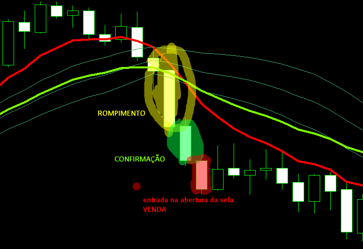 Preço dentro da banda > (Quando as medias se cruzarem + rompimento da banda de bollingger de baixo) ao mesmo tempo + preço abaixo das medias e fora da banda > Esperar confirmação >Candle de cruzamento e rompimento ficou abaixo da media , iremos aguardar a prox vela, se a prox vela nao retrair e tocar de volta na banda de baixo > Sinal de venda