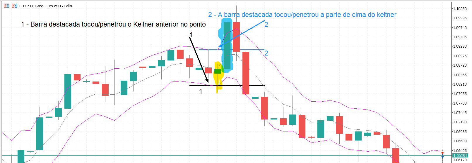 Compra quando o ativo toca a linha inferior da keltner do dia anterior, como segue a imagem, e venda assim que cruzar a keltner superior do dia anterior, também na imagem.