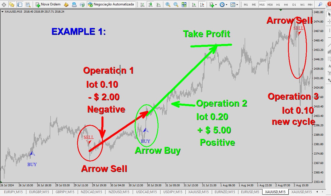 Let's go. In the arrow indicator, we know that a perfect trend does not always happen, and based on this principle, sometimes there are small losses, only to have a good trend later. The idea is that when the EA loses, it closes negative on the last trade, or closes negative on the last trades. Then, when the EA becomes positive on a next trade, it will analyze and close positive to cover, compensate for the previous negative trades. When this happens, it starts a new cycle with the initial lot setting.