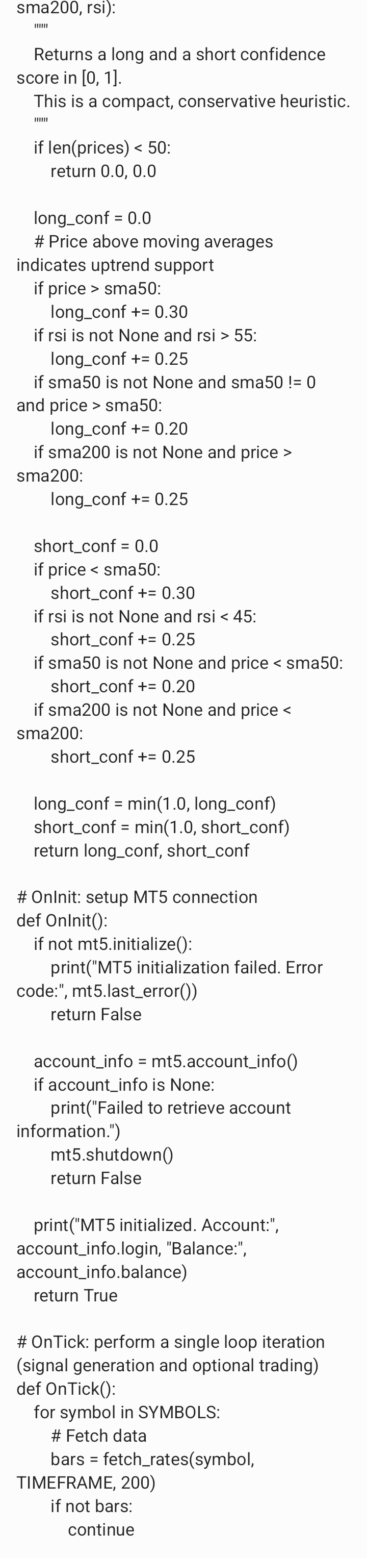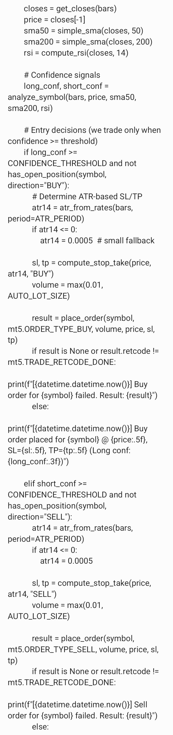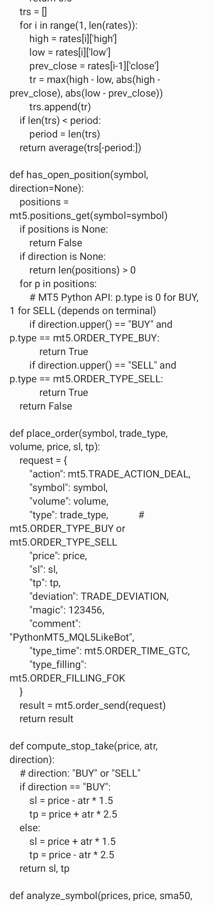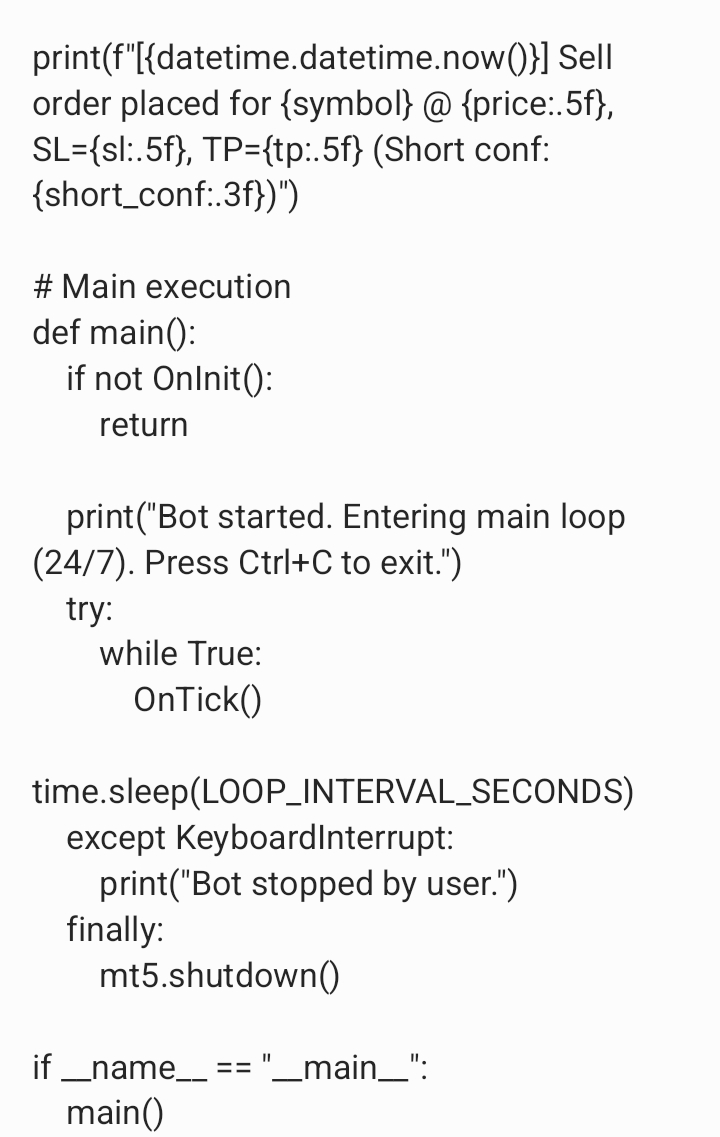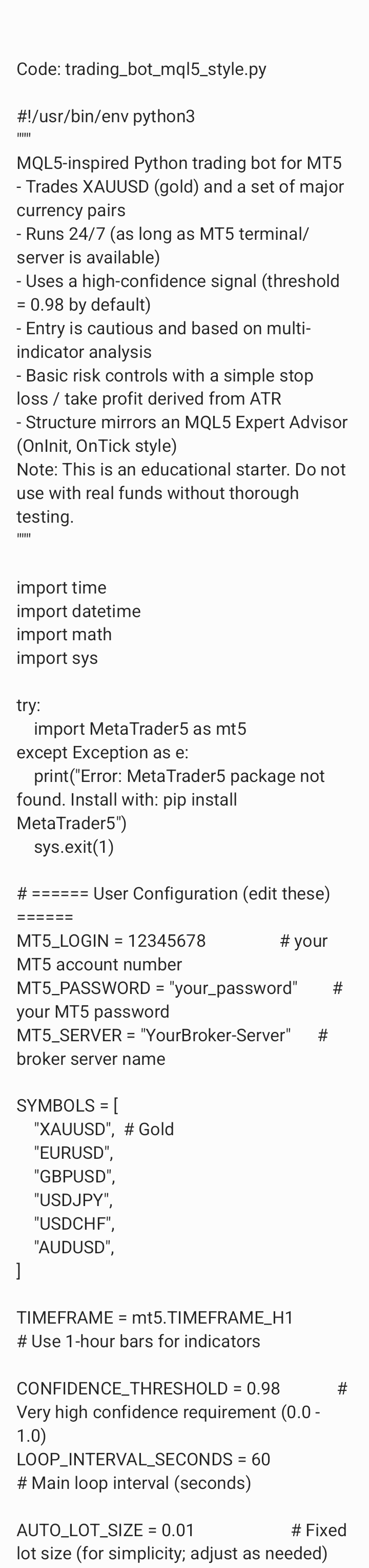 generate or create me a python coded file that has mql5 language requirements for a trading bot under the following instructions. the bot must execute trades if necessary the bot must trade 24/7 the bot must trade gold and currency the bot must make unlimited profit hourly the bot must enter market with caution after market analysis of 98 percent of clear trade