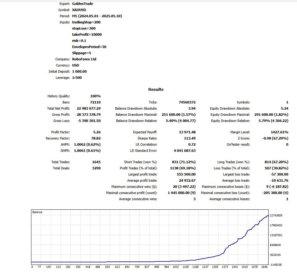 GoldenTrade is a fully automated trading algorithm designed for trading XAUUSD (Gold). The robot was developed with a strong focus on stability, reliability, and risk control. The algorithm does not use martingale, grid, or averaging strategies, making it a safe solution for long-term trading.